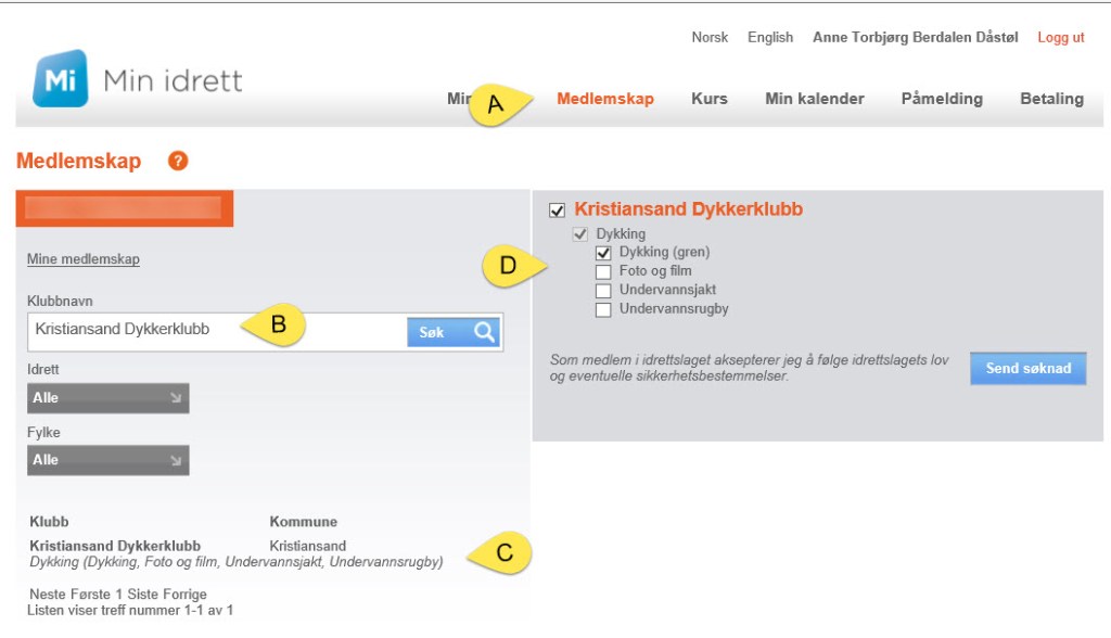 B) Søk opp Kristiansand Dykkerklubb.